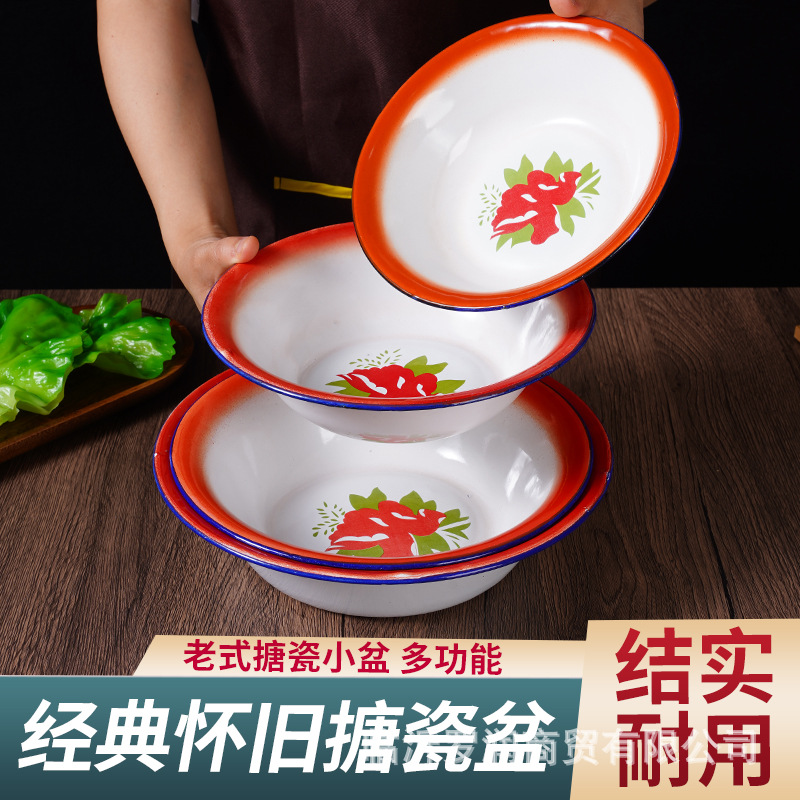 エナメル碗の古いレトロなホテルのレストランのレトロな赤いスープの碗の洋磁器の鉄の碗の鍋の麻辣热の調味料のたらい