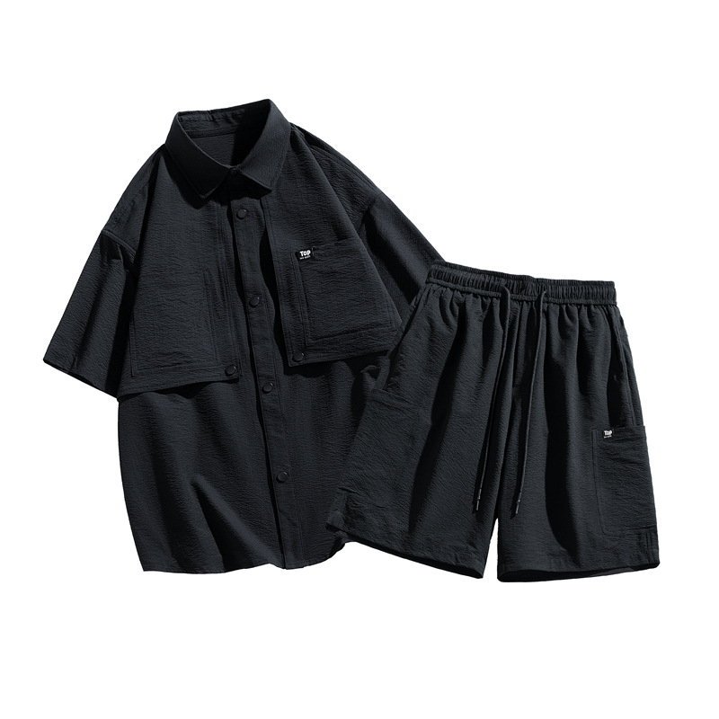公版は純色の爆発的な男性の夏のスーツの襟の半袖のシャツの5分の半ズボンの高品質の潮流を開くことができます。