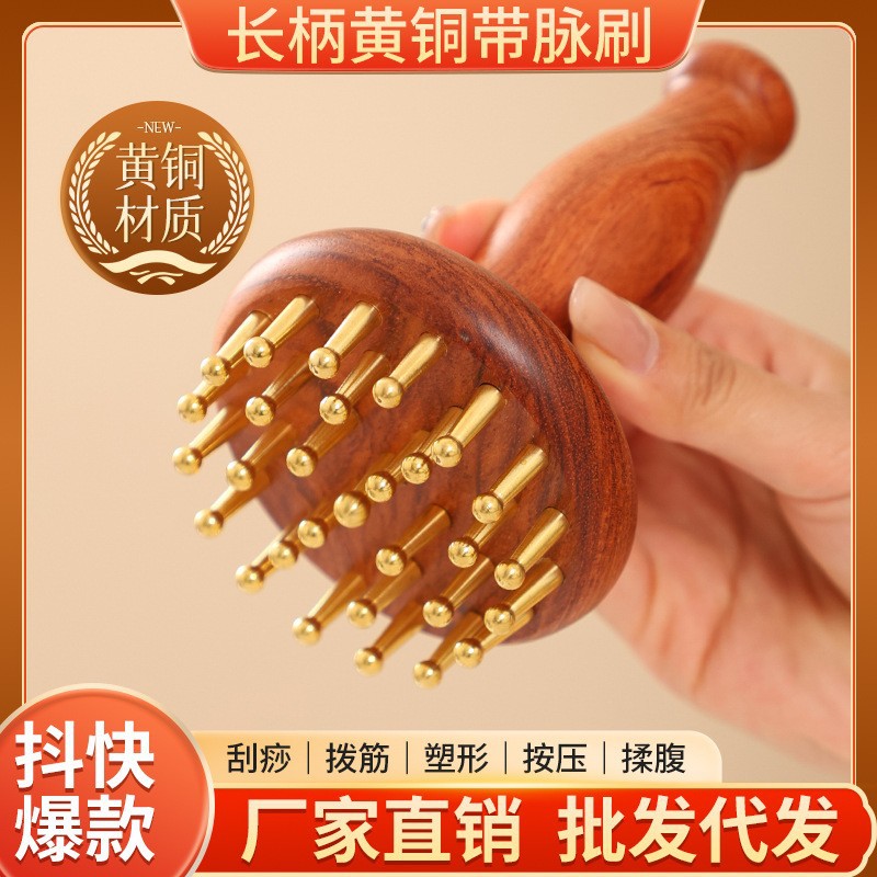 真鍮製経絡ブラシ、檀香と紫檀の柄、腹部マッサージ、頭皮の経絡を整えるマッサージツール