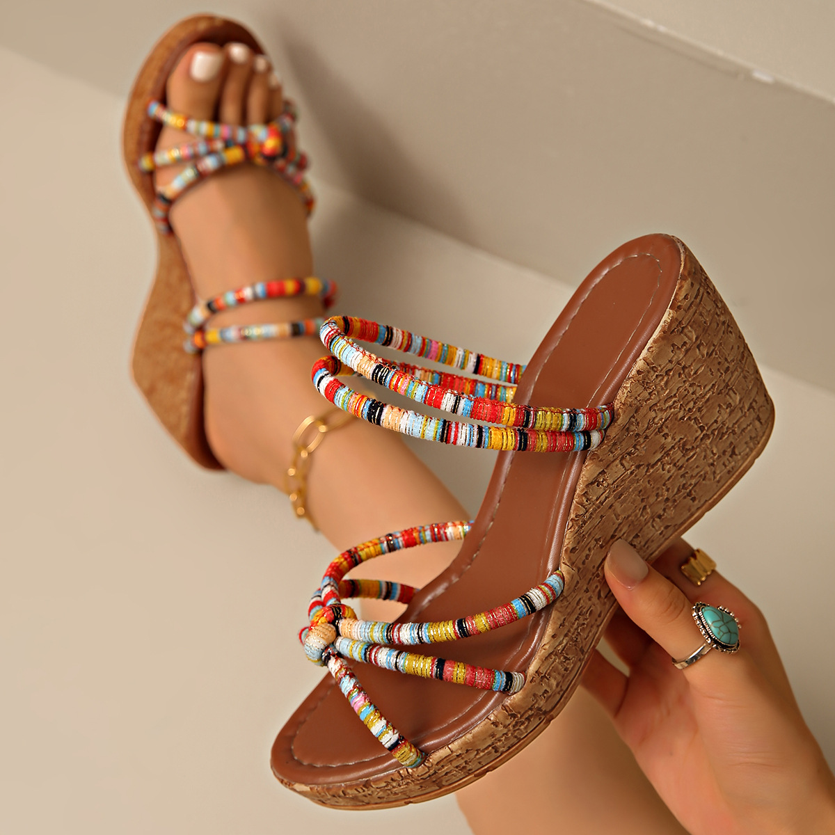 2025 夏の新スタイルクロスボーダー外国貿易大きいサイズウェッジレトロボヘミアンスタイル多用途ファッションツーウェア厚底サンダル