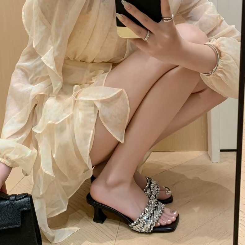 2025年夏の新スタイルのポインテッドトゥスティレットハイヒール、スリムなフレンチファッションカジュアルトゥキャップハーフスリップレディースシューズ