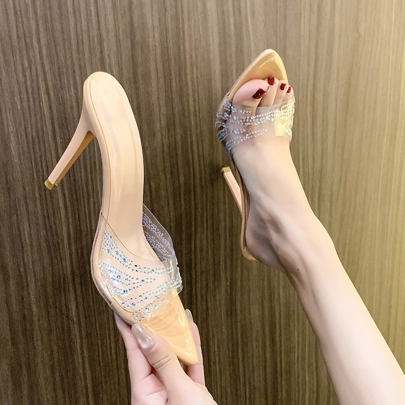 2025年夏 レディース スカートと合わせた細いヒールのラインストーンハイヒールスリッパ、ポインテッドトゥのハイヒール、おしゃれで足が疲れにくい、デイリー