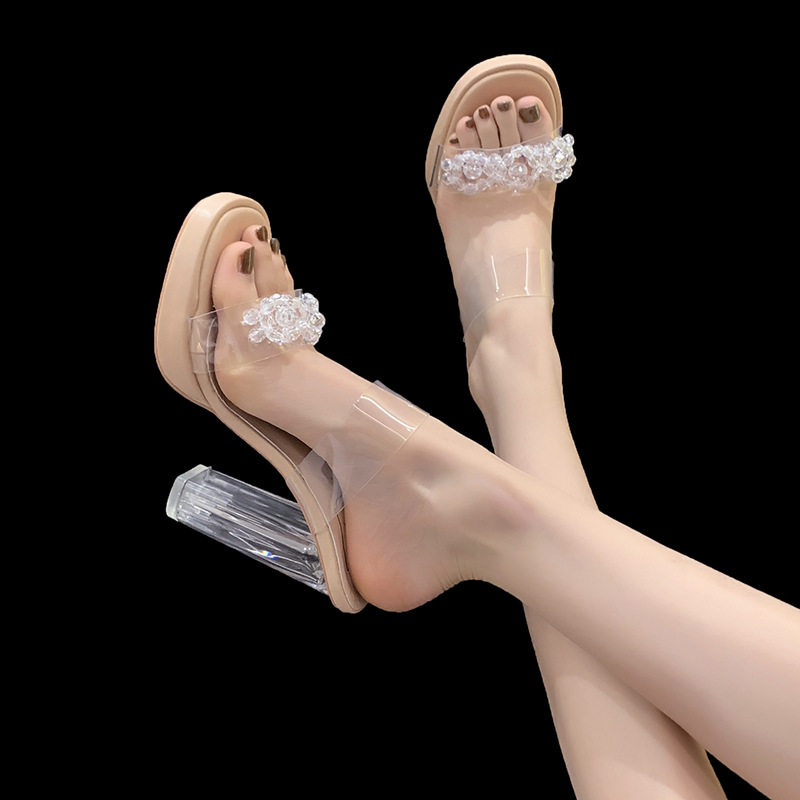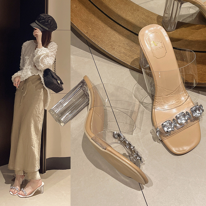 2025 夏の新スタイルフレンチクリスタルハイヒール女性のアウターフェアリー透明厚いヒールスリッパ