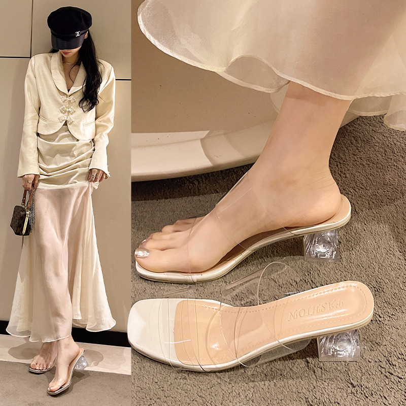 2025 新しい夏の透明ハイヒールスリッパ女性の夏のアウターウェアクリスタル厚いヒールサンダルフレンチハーフスリッパ