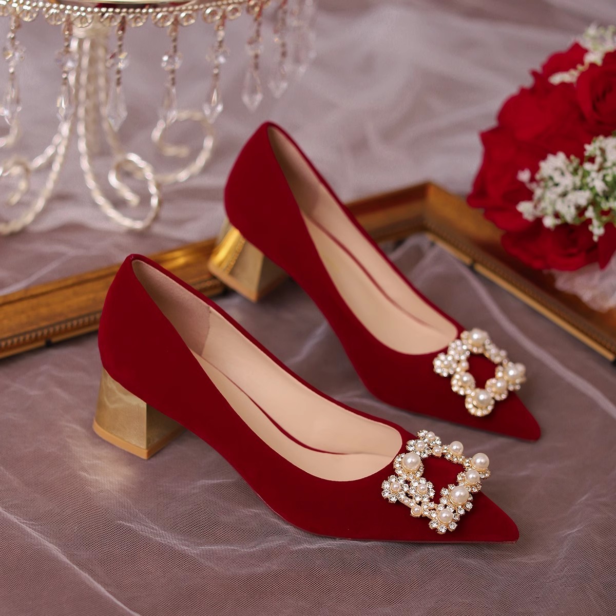 結婚靴の女性の太さと2025春秋の新しいベルベットの花嫁靴は疲れていない赤い秀イネ服のウェディングハイヒール