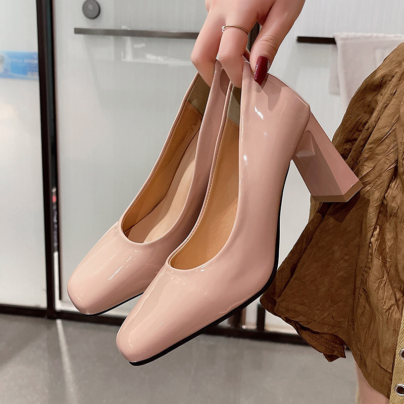 スクエアトゥチャンキーヒールレディースシューズ2025春新作おしゃれカジュアルスリッポン革靴ヌードカラー浅口ハイヒール
