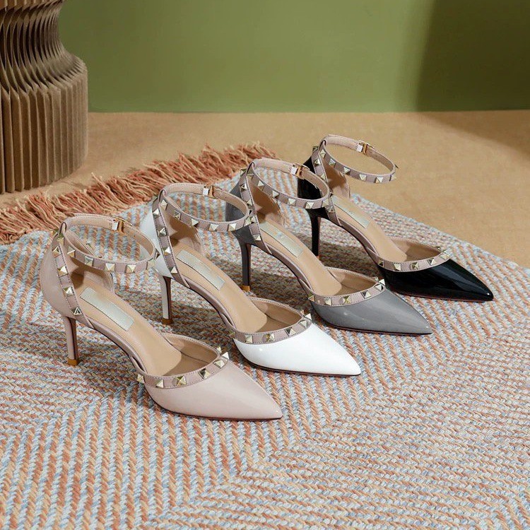 2025年春秋新作 レディース リベット付きハイヒール 浅口 ポインテッドトゥ 細ヒール セクシー レディースシューズ ポインテッドトゥ パテントレザー V字型シングルシューズ