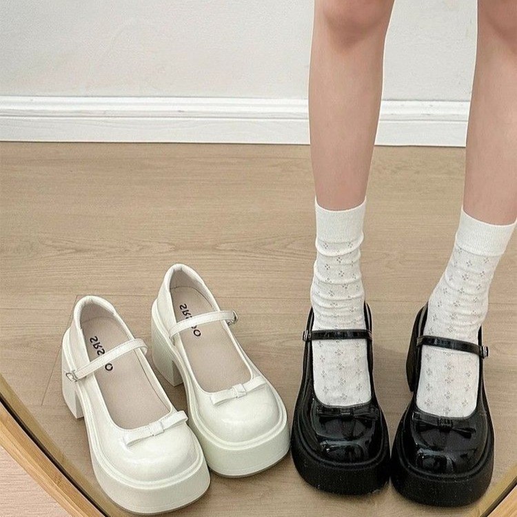 黒い靴の女性2025秋の新型の厚い底の蝶結びの靴の英倫風の太さとロリータのハイヒール