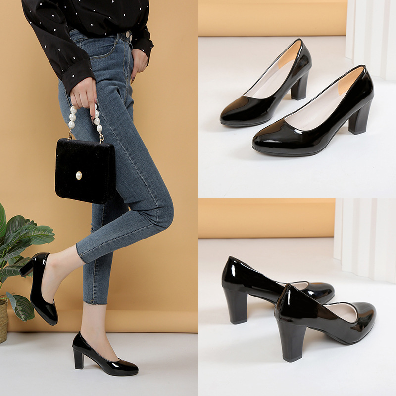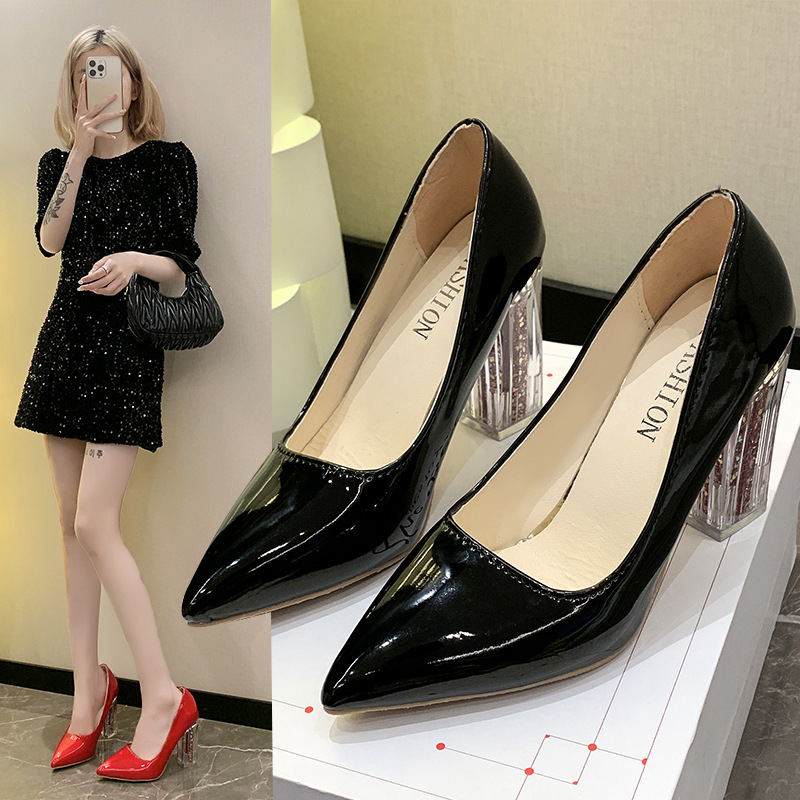 大きいサイズのハイヒールの女性の2024秋の新型のセクシーな太さと先の靴の浅い口の漆の皮の1足の作業靴