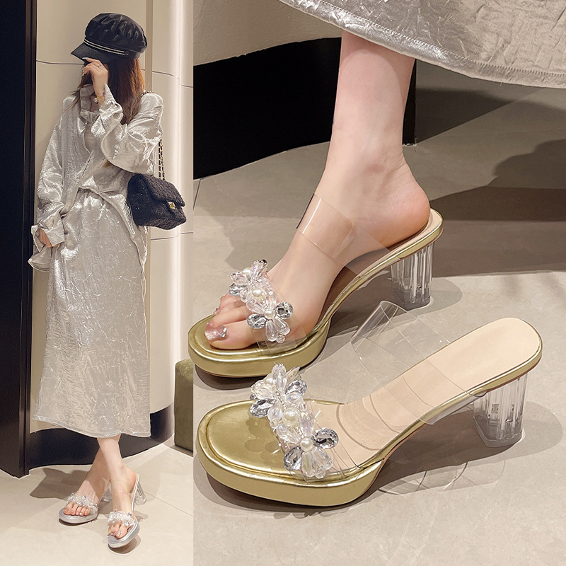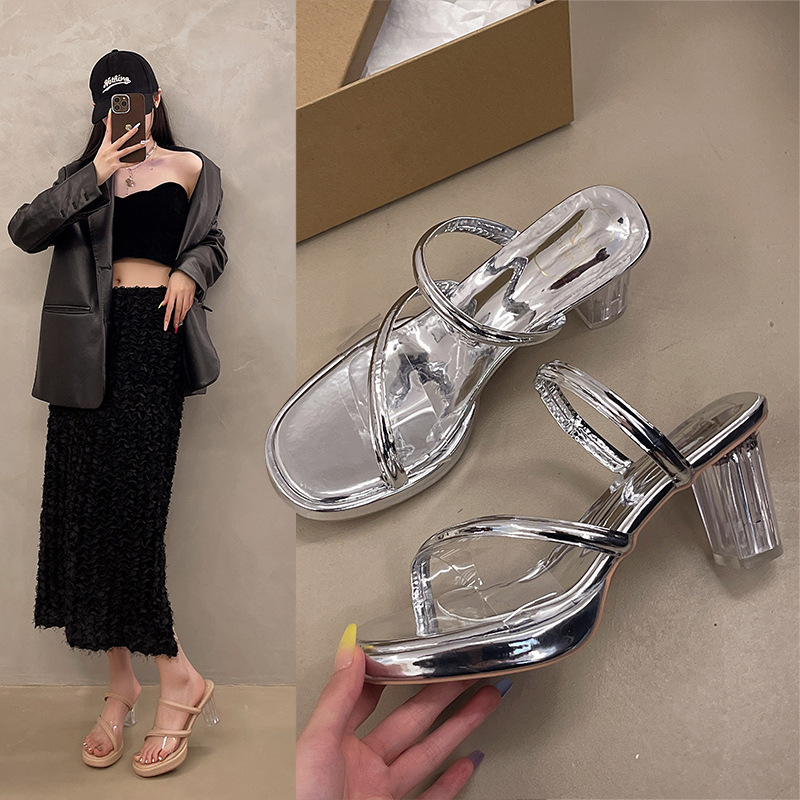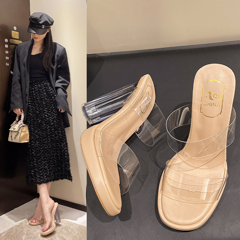 ネットセレブサンダル女性の夏のアウターウェア 2025 夏の新ファッション厚いヒールクリスタルハイヒール透明サンダル