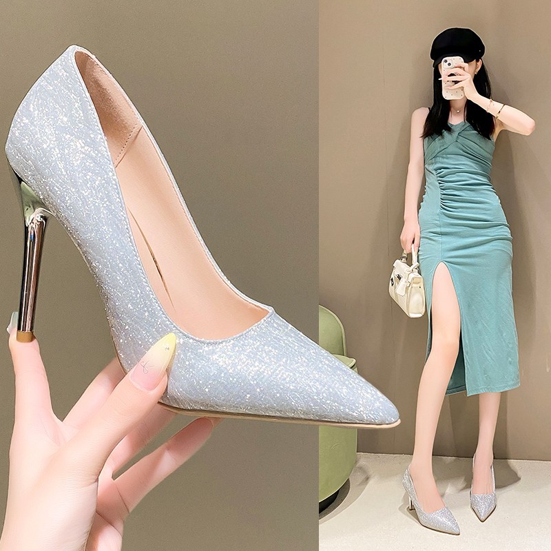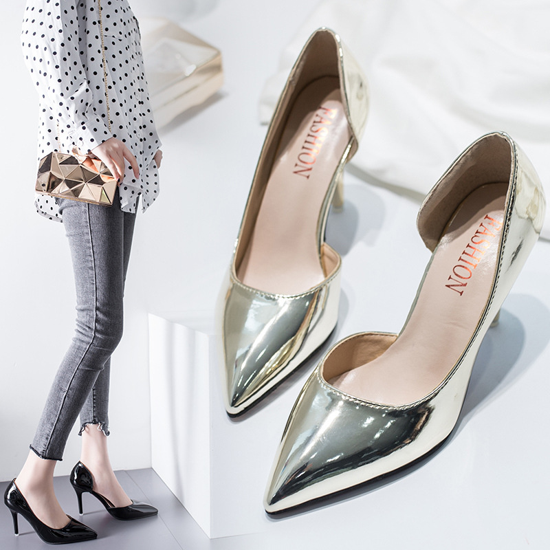 2025 夏の新韓国スタイルの浅い口の尖ったハイヒールの靴、セクシーで多用途なスティレットヒールの靴、女性用の気質のあるゴールデンの結婚式の靴