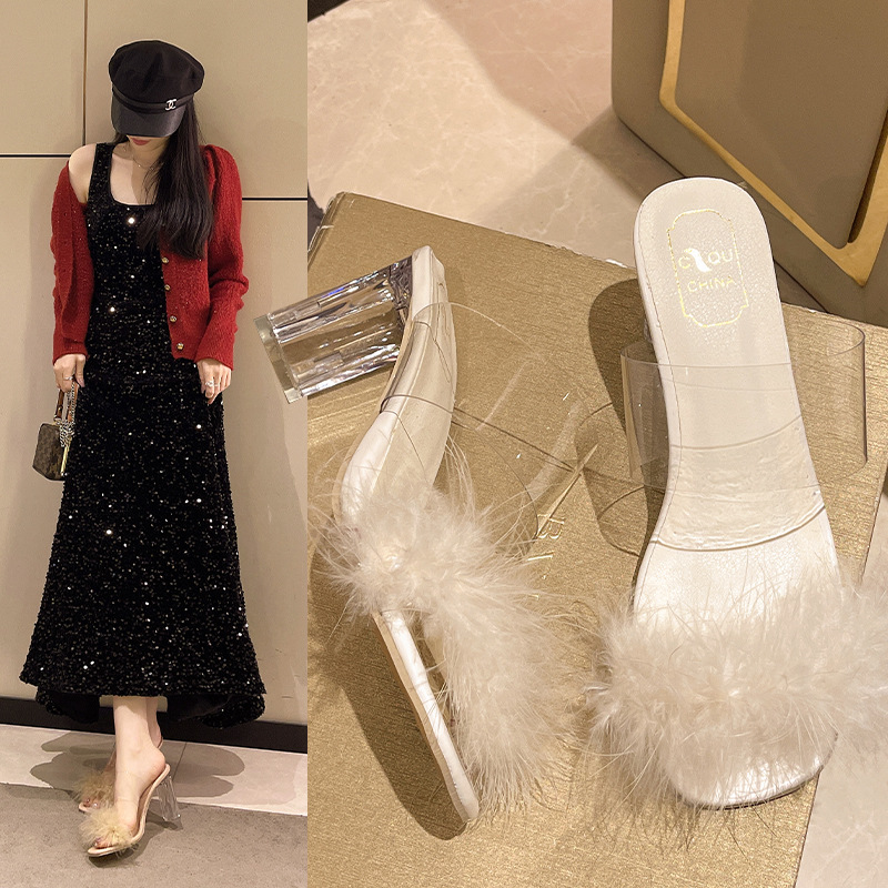 気質毛皮スタイルデザインニッチ透明クリスタルハイヒール 2025 夏の新日本製厚底サンダル