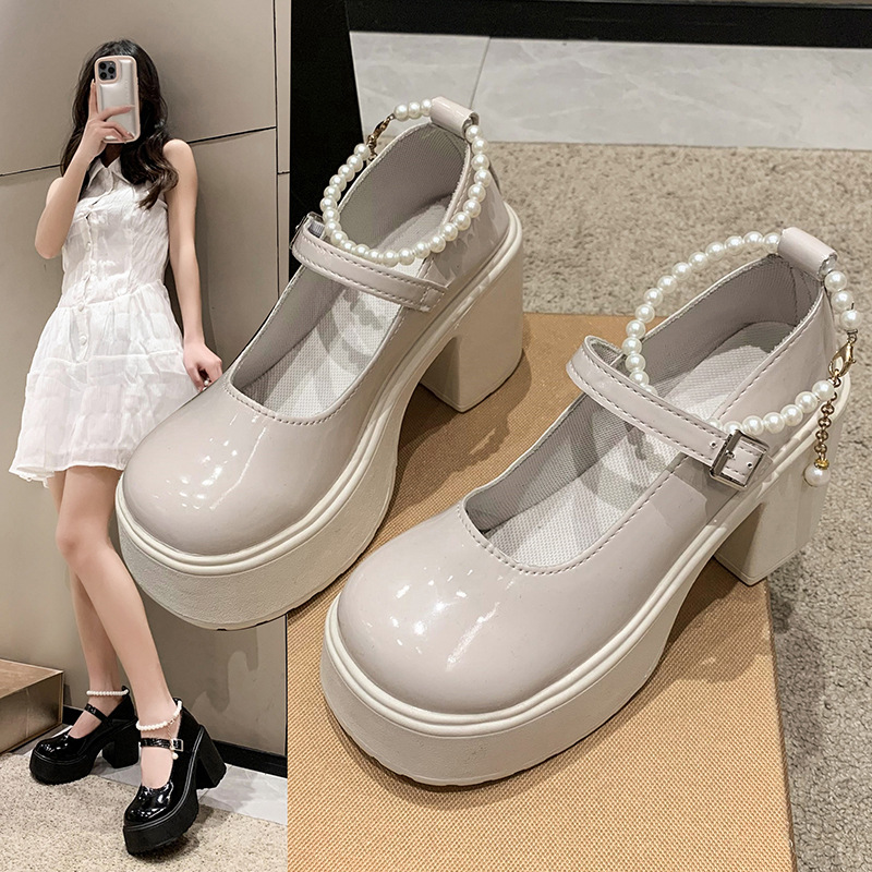 2025 夏の新レトロ防水プラットフォームハイヒールシングルシューズワンラインバックル厚いヒールパールチェーンメリージェーンシューズ女性の靴