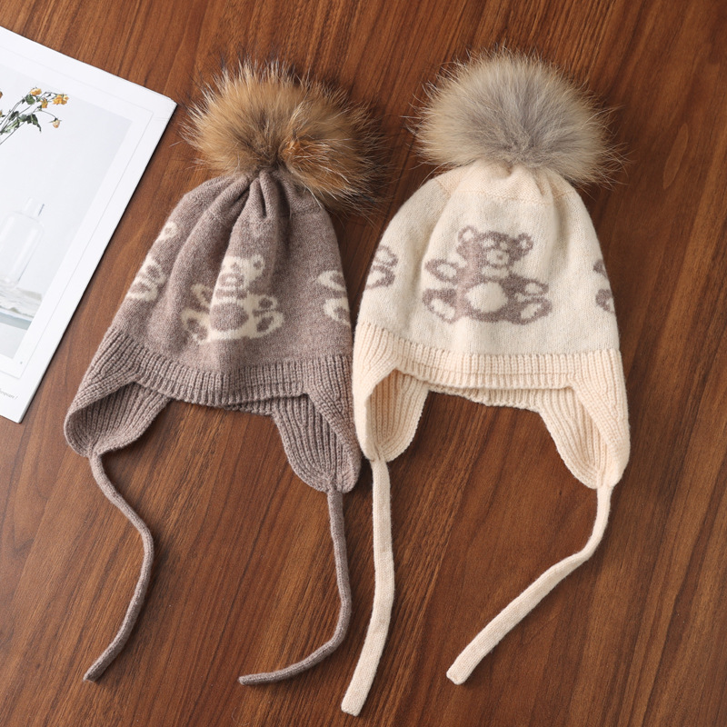 秋冬の男性と女性のためのカシミア帽子、厚くて暖かく防寒性のあるウール糸、ボール付き親子包頭耳保護パイルニット帽子