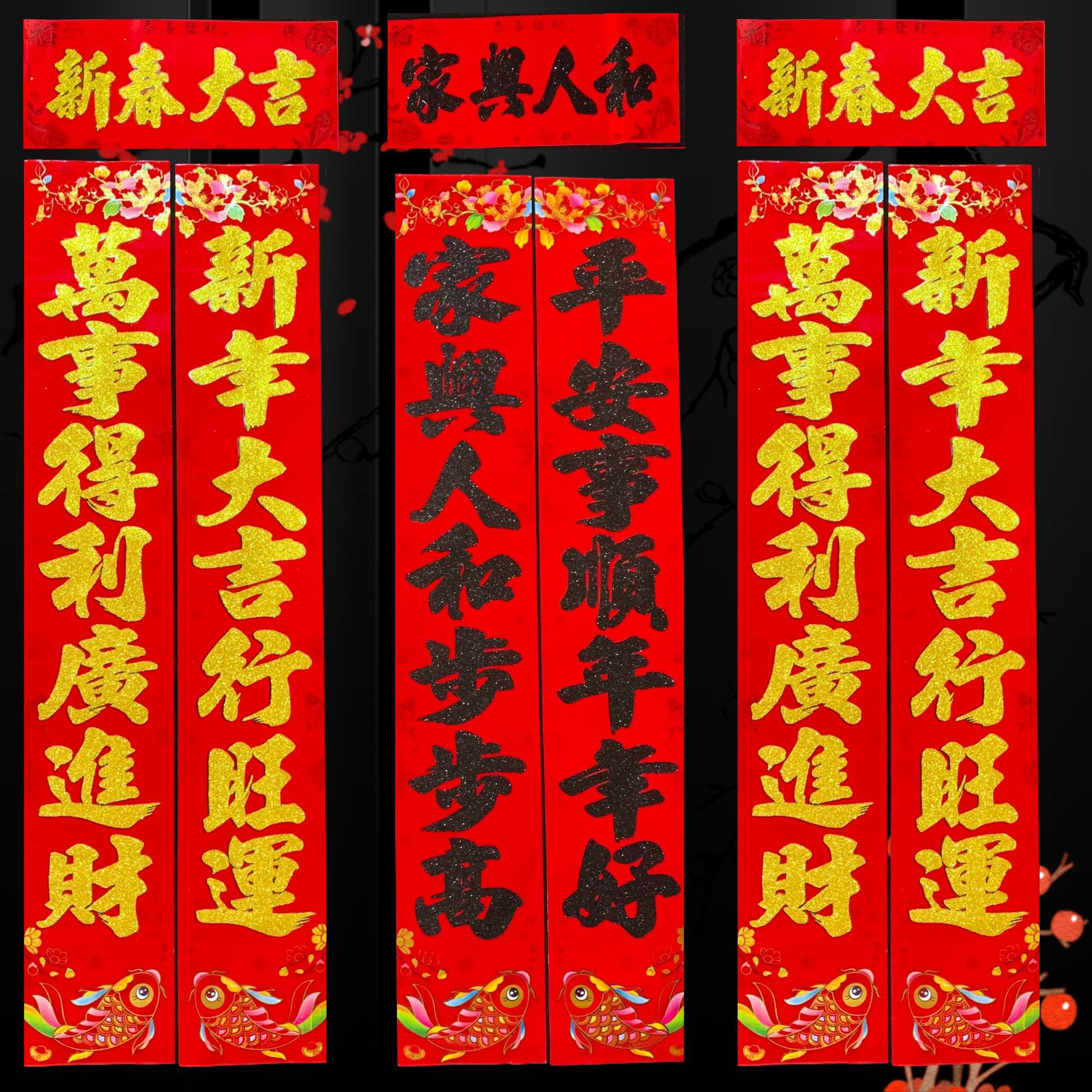 馬年新作 箱入り植毛粉飾り春節対聯 新築祝い金粉黒粉七字春聯 ドアステッカー