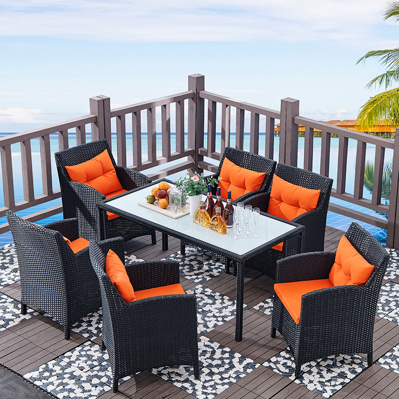 屋外のテーブルと椅子の別荘の庭のテーブルと椅子のレジャーの露店の藤の椅子は木のテーブルを作って組み合わせます。