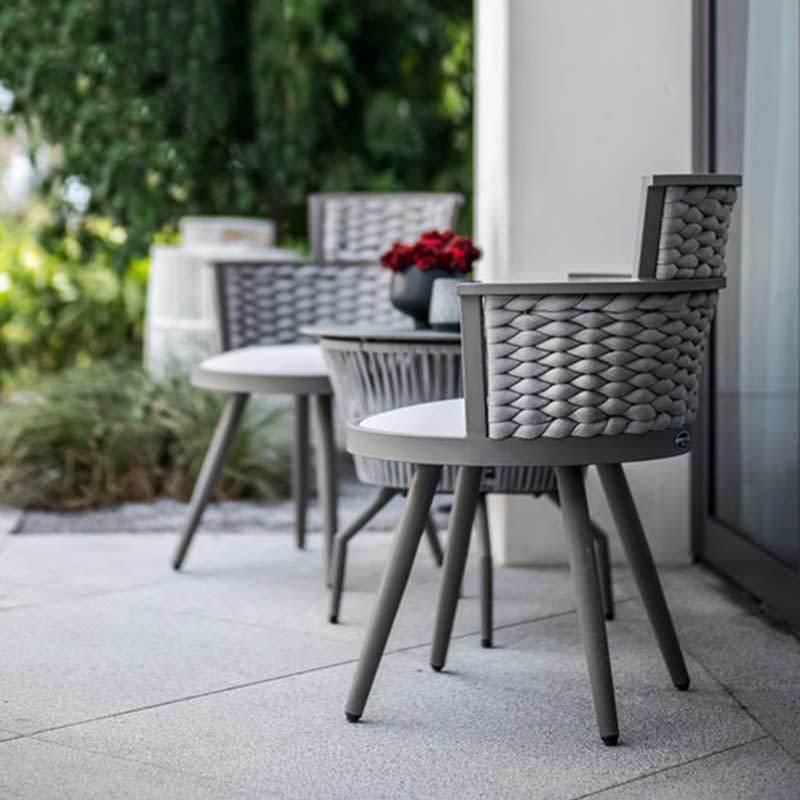 北欧の屋外の藤の椅子の3つのセットの花園は食事の椅子の1人の椅子のレジャーのテーブルと椅子の防水の庭のデザイナーを編みます。
