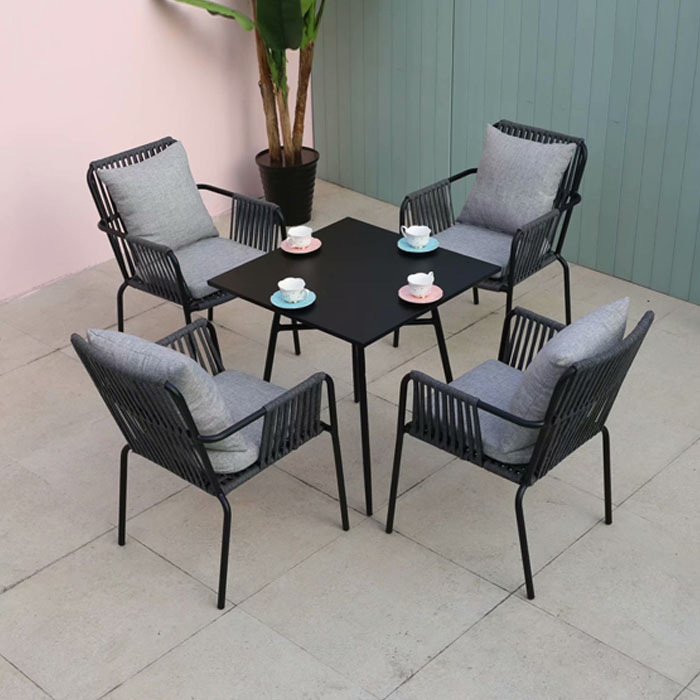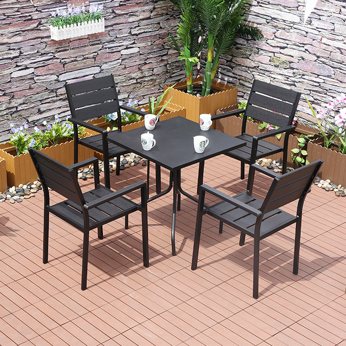 黒色のプラスチック製の木の庭の多くのセットの組み合わせの花園の別荘の屋外のレジャーの家具のベランダの木製のアルミニウムの木の小さいテーブルと椅子
