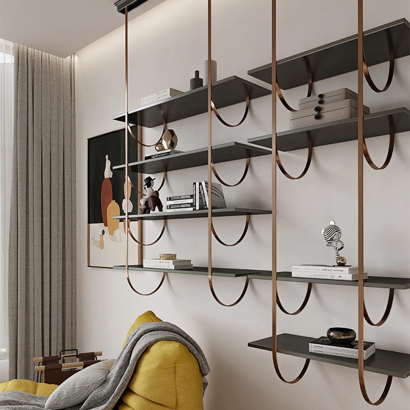 イタリア式の仕切りの収納棚は極めて簡単です。本棚の上の壁の置物棚の金属陳列ハンガーの簡易ワイン棚です。