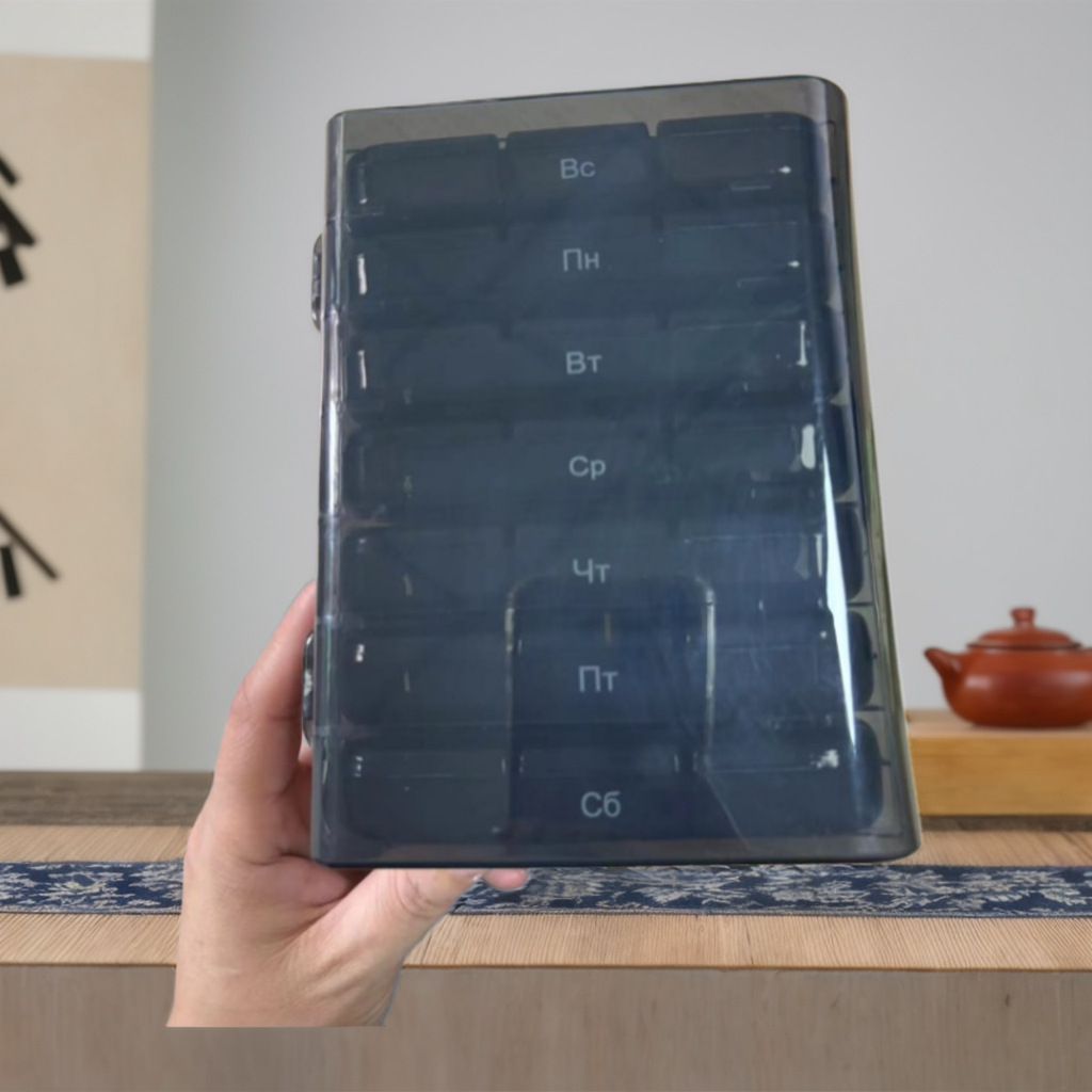 ロシア語の薬箱は一週間七日に21格の黒い薬箱に分類されています。