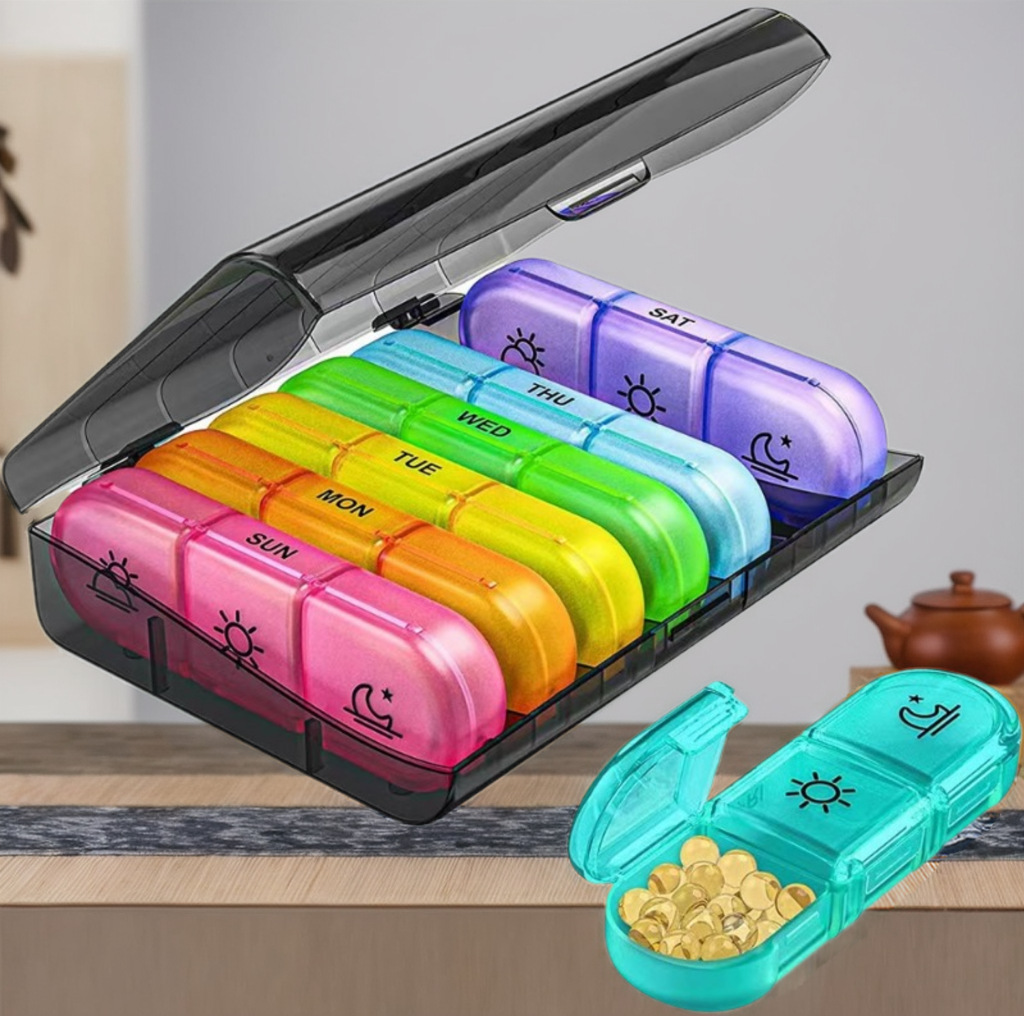 Amazonの新しい1週間14コンパートメント朝と夜のピルボックス、便利な1日2回PPプラスチック製の小さなピルボックス