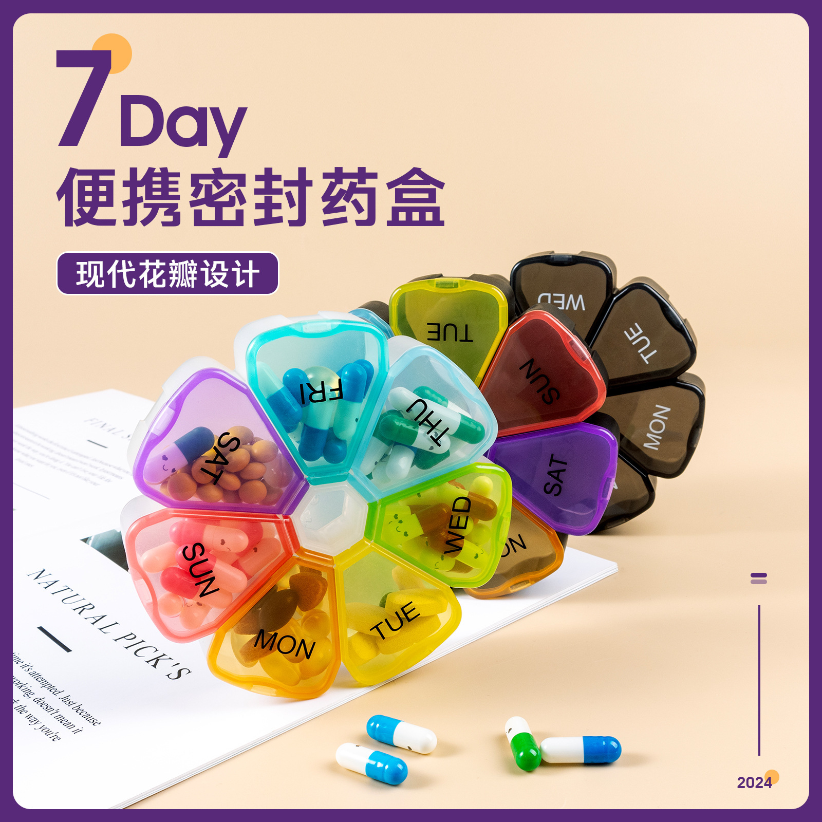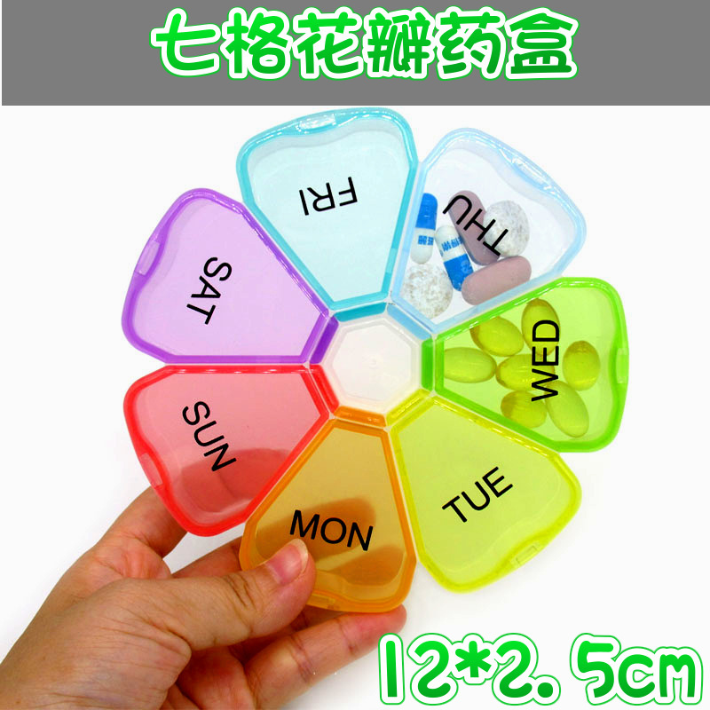 Amazonの人気商品、7日間ポータブル7コンパートメントピルボックス、ヘルスケア製品包装ピルボックス、花びら型ピルボックス