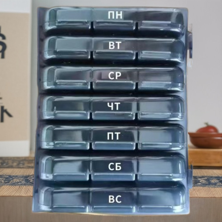 ロシア語の薬箱は一週間七日に21格の黒い薬箱に分類されています。