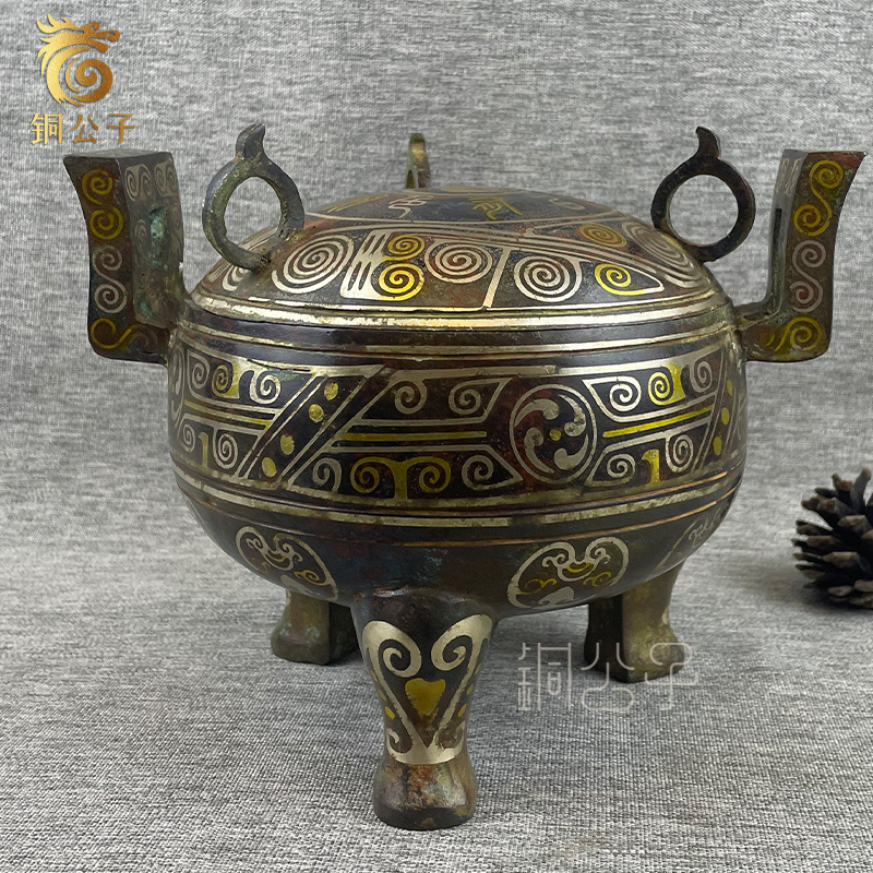 金と銀の蓋付き三脚円鼎装飾品銅工芸品コレクション卸売博古ラック教育ディスプレイ教材