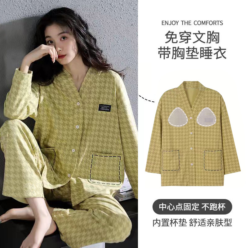 純綿パジャマ女性秋冬2024年新型胸パッド付き長袖家庭服ズボンセット