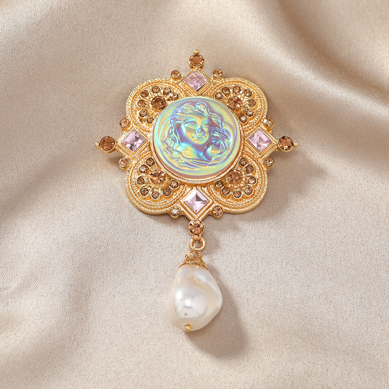 レトロな宮廷のバロックは真珠の天使のブローチをまねます。
