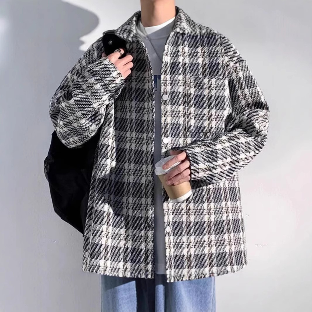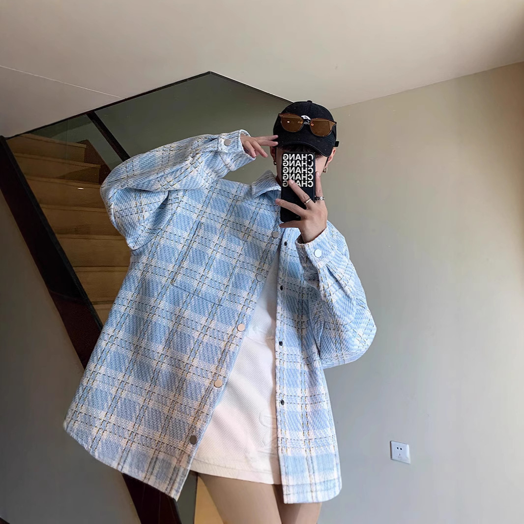 小香風コート男春秋高級感格子潮牌大サイズシャツ襟かっこいいカップルゆるいジャケット
