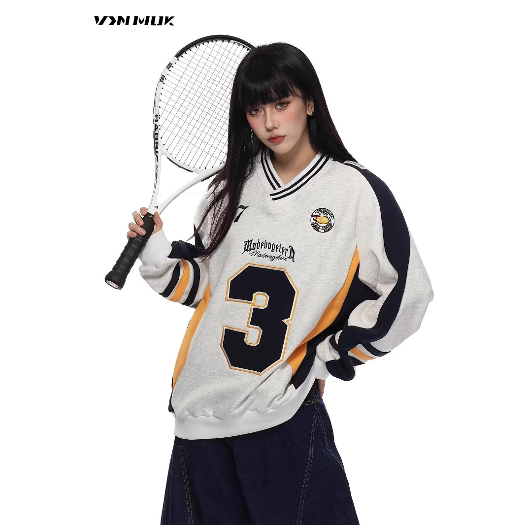 国潮のアメリカの高い街は色のvネックのボールの服の女性の春秋のoversizeの怠惰な風の長袖の上着にぶつかります。