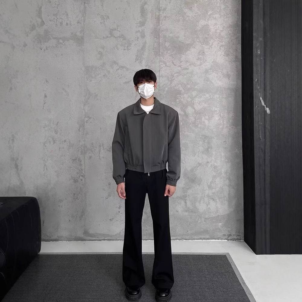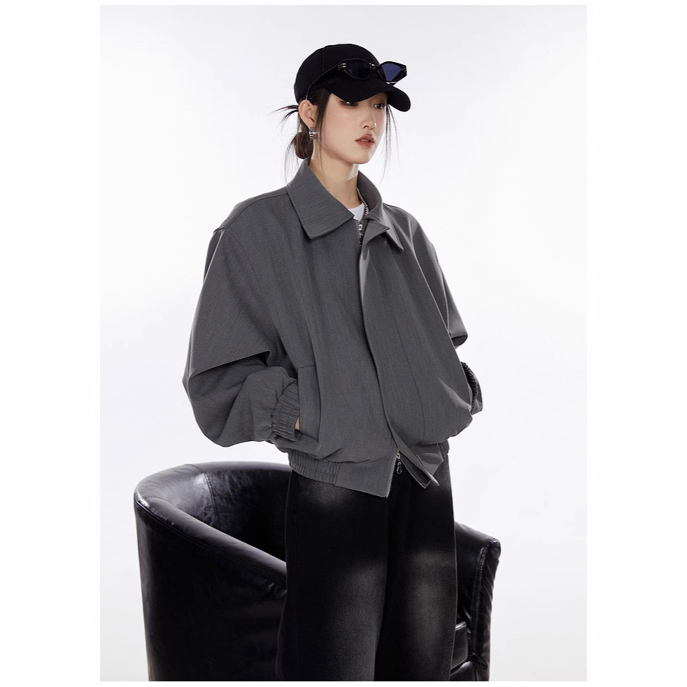 シンプルなショート幅肩のジッパージャケットboxy秋の高級感があります。