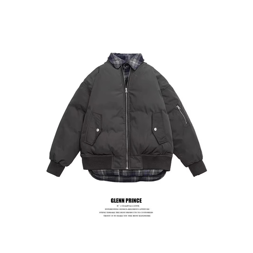 アメリカのレトロなつなぎ合わせの偽の2つのパンの服の男性のアマゾンの冬の高い街のデザイン感は厚い工装の綿の服の潮をプラスします。