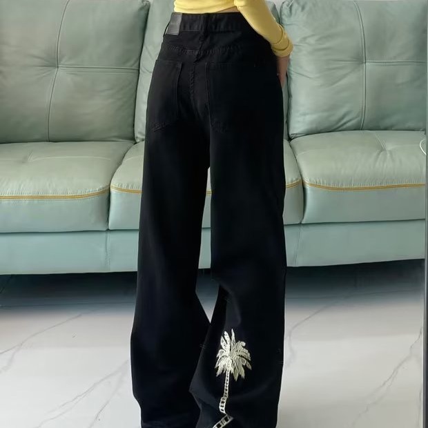 アメリカ刺繍ジーンズ男女復古シンプルカジュアルワイドパンツゆるいストレートココナッツの木の黒いズボンが湿っている