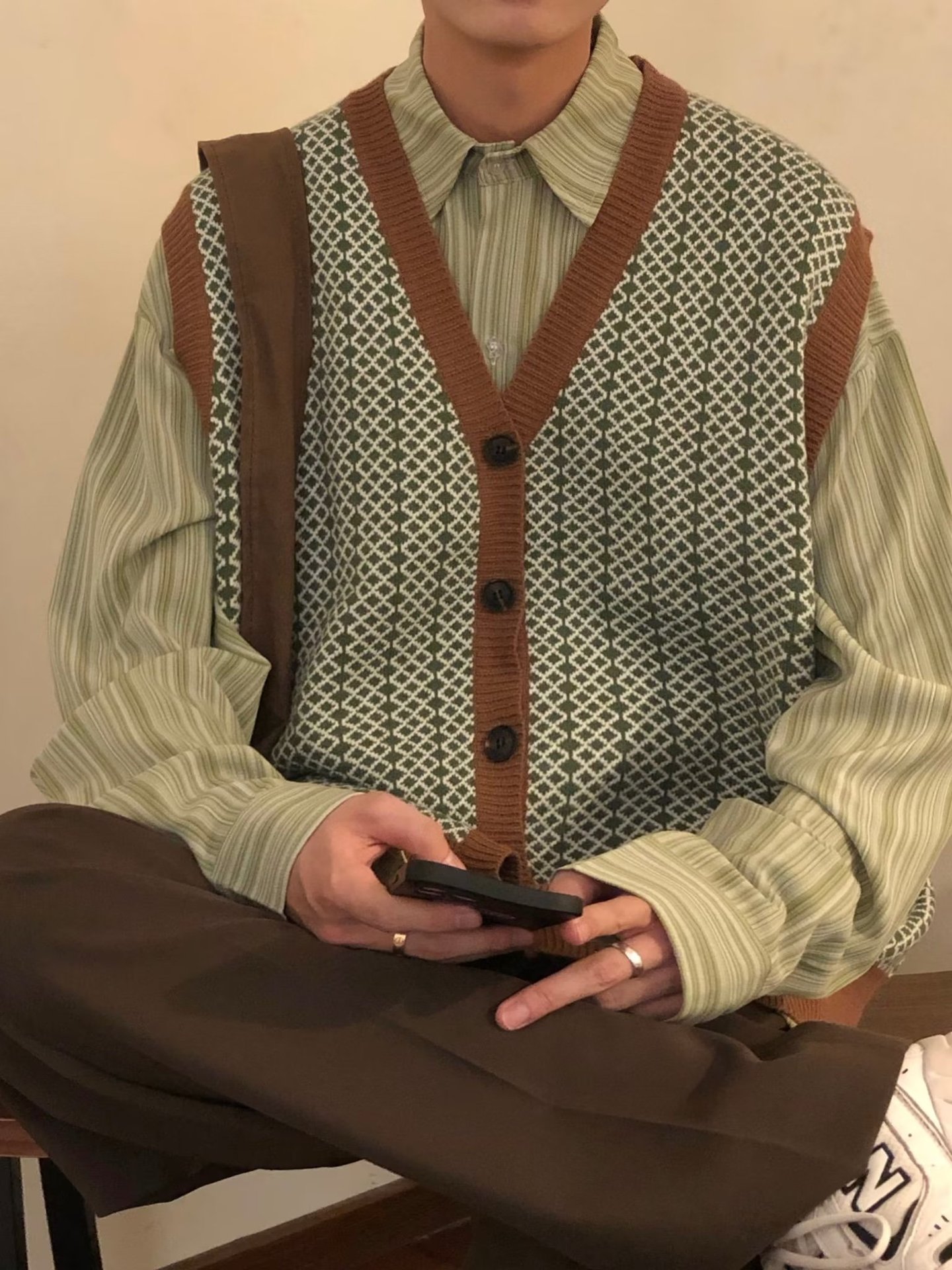2022秋装レトロ港味セーター馬甲男女ゆるいアメリカ菱格外着ニットベスト