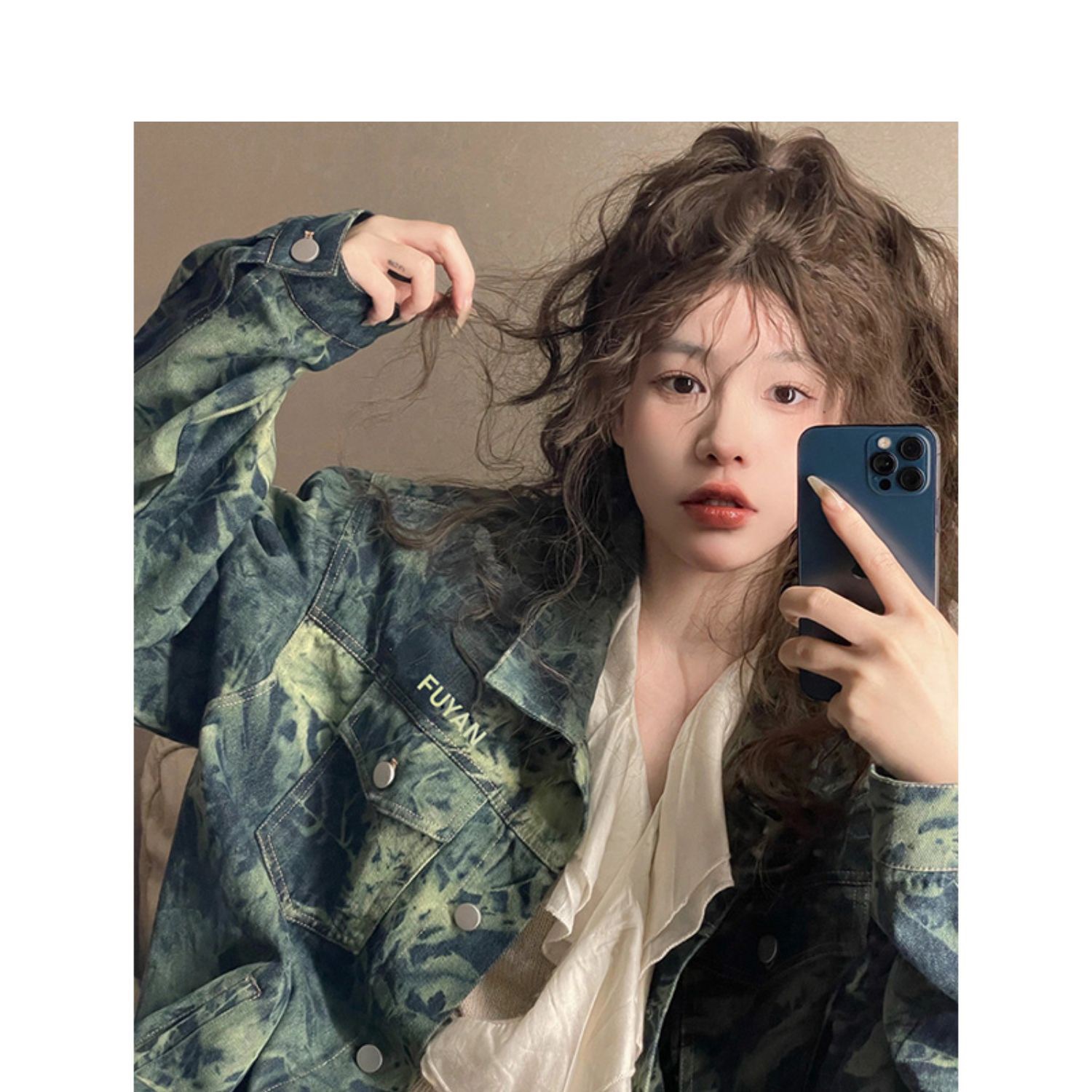 デニムジャケット小清新風日韓スタイル染め新作襟折りパンクゆるいプリント中性スタイル男女