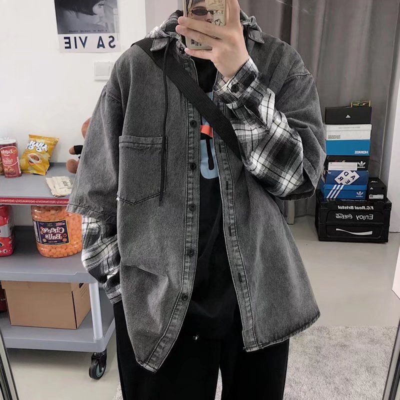 デニムジャケット男性春秋韓国版ゆったりとしたステッチ偽の純綿コートのファッション格子の大きいサイズのデニムコート