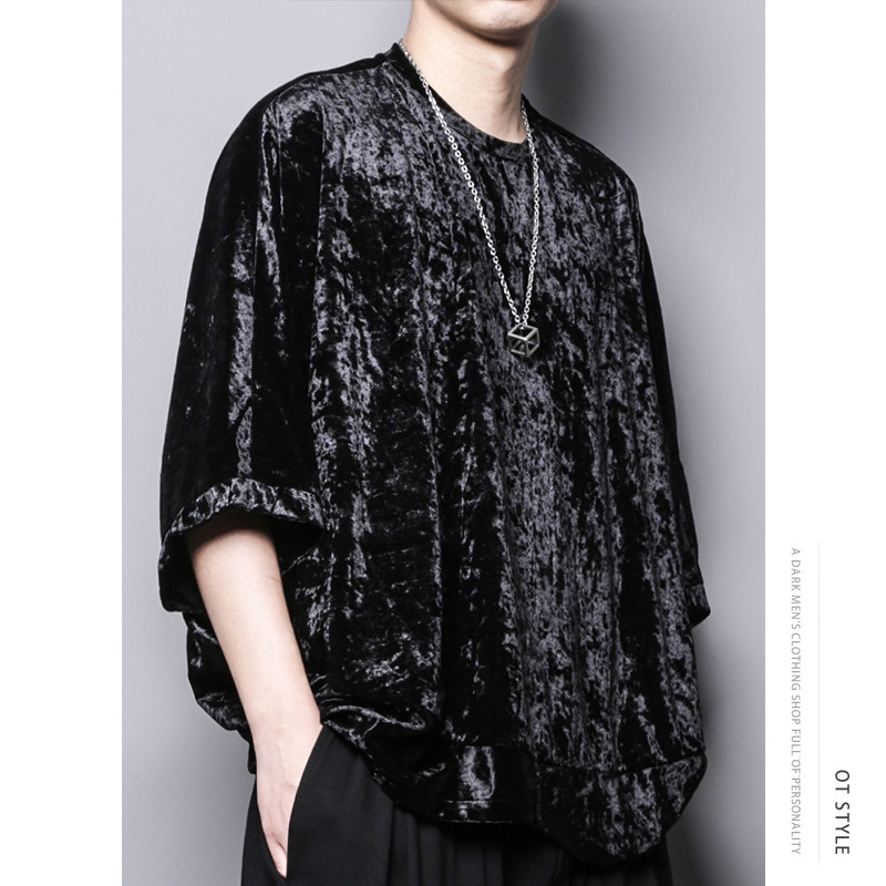 ダーク系tシャツシンプルで個性的な光沢感のあるベルベットの丸首半袖欧米デザイン感の個性的な夏の半袖