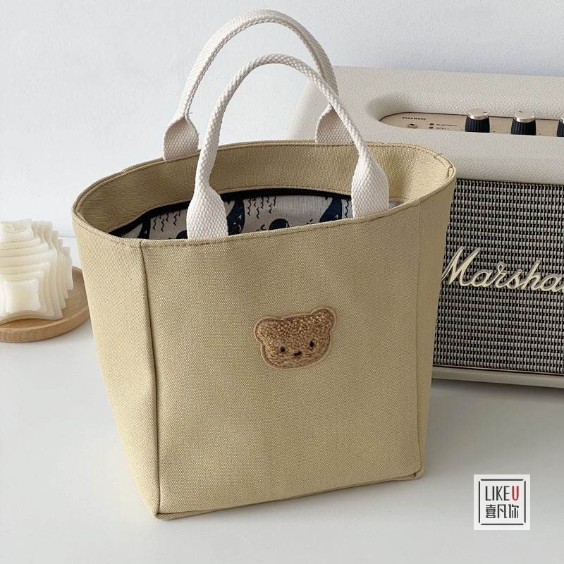 オリジナルデザインの日系純色キャンバスハンドバッグの熊がシンプルで、文芸レジャー学生弁当の弁当箱にぴったりです。