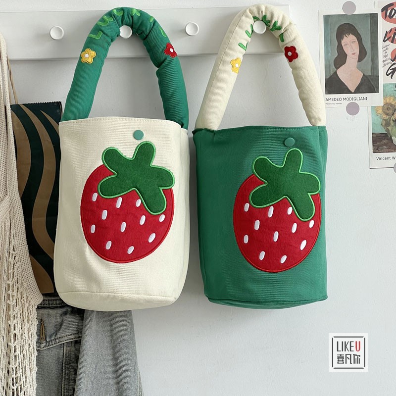オリジナル刺繍いちご日系小バケツ型トート帆布シンプル文芸小容量手提げ弁当弁当箱包