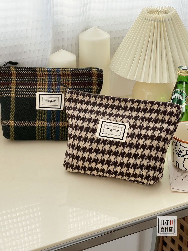 オリジナルの韓国版レトロでシンプルな高級感のある格子縞の毛です。化粧バッグの携帯用スキンケア用品の収納バッグです。