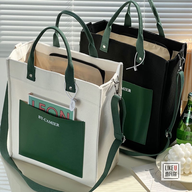 オリジナル手作りジッパー付き立体型キャンバスバッグ 学生用弁当箱バッグ 手提げ斜め掛けバッグ 弁当バッグ