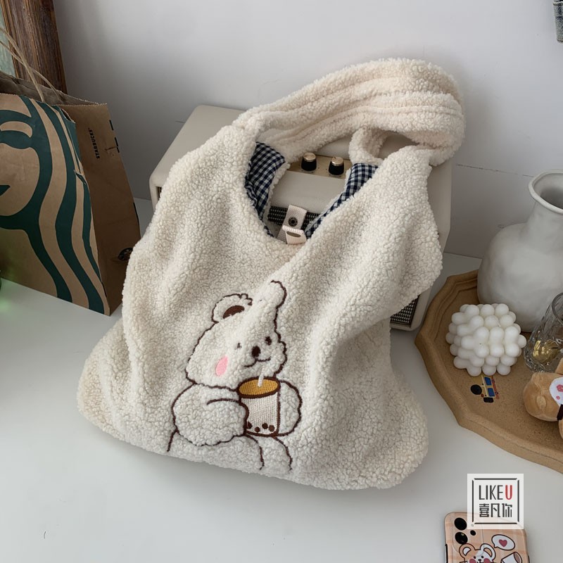 2023秋冬毛むくじゃら刺繍アニメかわいい羊の小毛の女性カバンins韓国版文芸大容量ショルダーバッグ