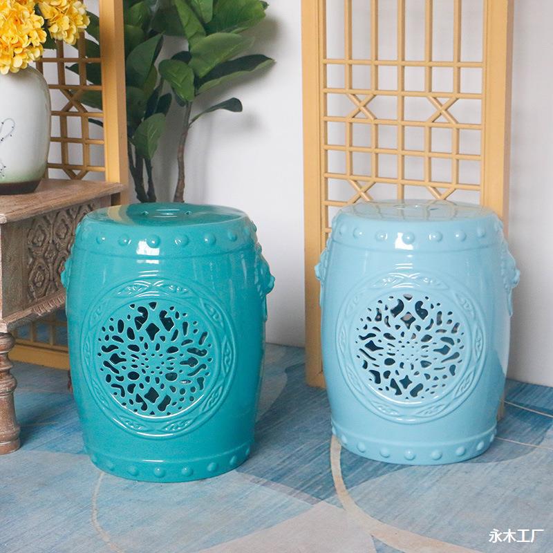 モダンな彫刻中空セラミックドラムスツールリビングルームバルコニークリエイティブサイドテーブル玄関靴交換スツール家の装飾磁器スツール