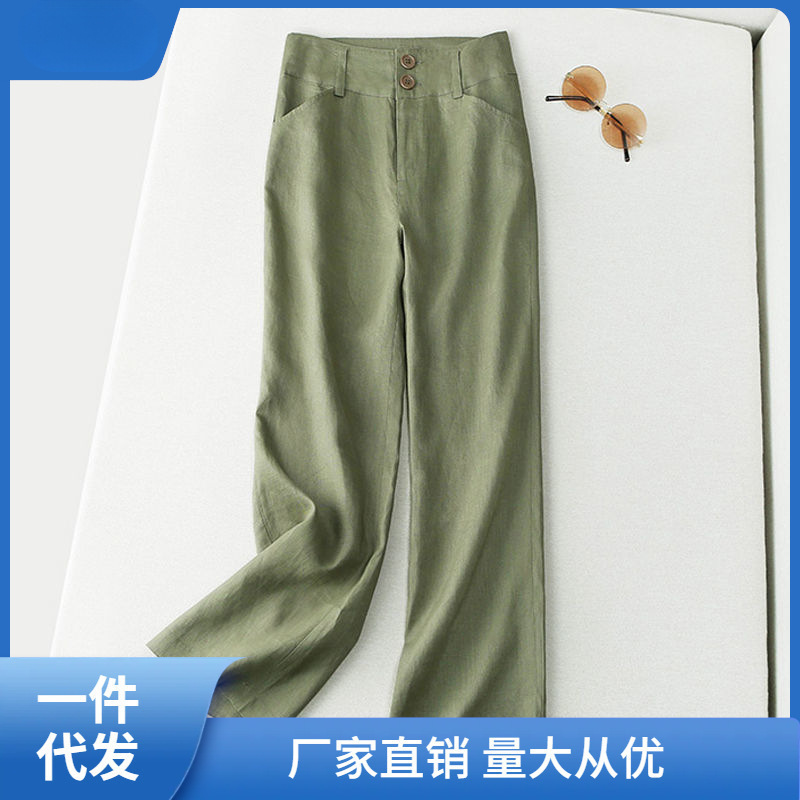 フランスに輸出、漏れ拾い、文学的で芸術的なレトログリーンリネンワイドレッグパンツ、女性用ハイウエストドレープパンツ、Xuan Xin Xuan Na You