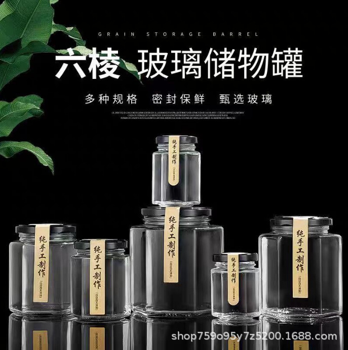 六角形のハニーガラスボトル 0.5kg パックチリピクルスボトル厚みのある透明な密封された食品缶詰ボトル蓋付き