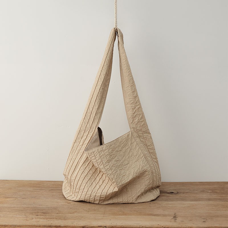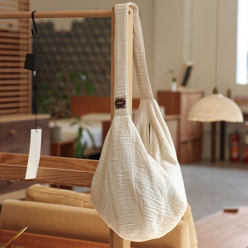 アーティスティックなレトロな和風斜め掛け大容量バッグ、森ガール風韓国風カジュアルなショルダーバッグ、多用途な綿麻プリーツバッグ
