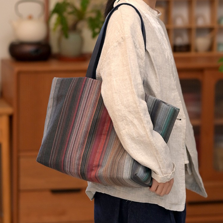 シンプルなシングルショルダーバッグ大容量ストライプ手提げトートバッグキャンバスバッグ通勤文芸バッグ