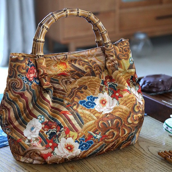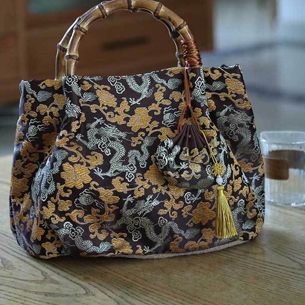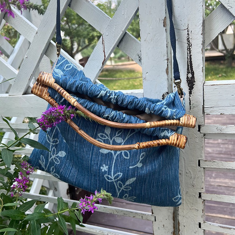 新中式レトロ綿麻国風竹藤ハンドバッグ、手提げ、芸術的で多用途、古風プリント竹節バッグ